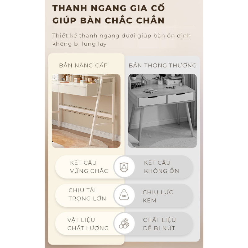 Bên cạnh việc tối ưu hóa không gian lưu trữ, GM175 còn được trang bị các tính năng bảo vệ chống bụi bẩn hiệu quả. Thiết kế các ngăn kéo khít, kín giúp ngăn chặn bụi bẩn xâm nhập vào bên trong, bảo vệ mỹ phẩm và các vật dụng cá nhân khỏi những tác động từ môi trường bên ngoài. Đồng thời, sự chắc chắn và ổn định của bàn còn được đảm bảo nhờ thanh ngang gia cố, giúp bàn luôn vững chắc trong suốt quá trình sử dụng. Đây là một yếu tố quan trọng giúp bàn trang điểm GM175 không chỉ bền bỉ theo thời gian mà còn duy trì tính thẩm mỹ và chức năng hoàn hảo.