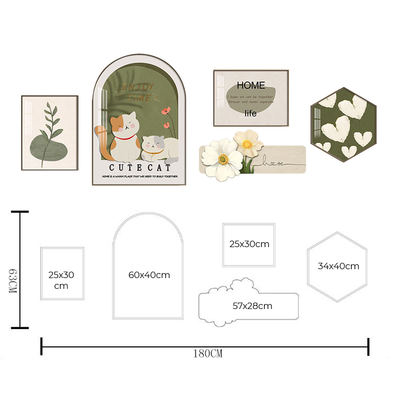 | Kích thước | Tranh chữ nhật (25x30cm) Tranh vòm (60x40cm) Tranh lục giác (34x40cm) Tranh hình đặc biệt (57x28cm) Cả bộ (180x63cm) (Kích thước cả bộ sẽ thay đổi theo cách sắp xếp) |