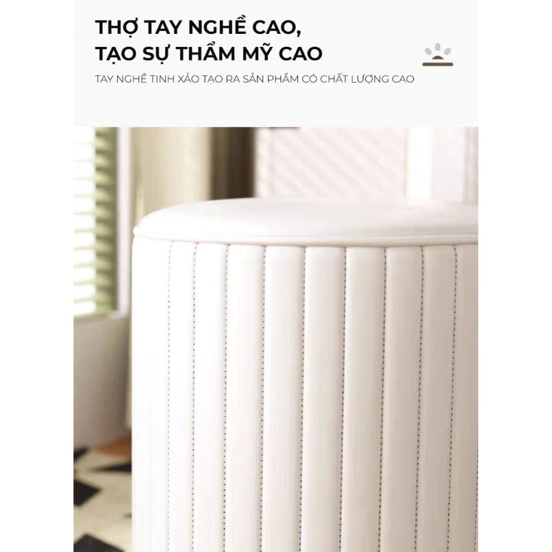 Ghế đôn GC45 được bọc da PU cao cấp, mang đến cảm giác êm ái cho người sử dụng. Chất liệu nỉ mềm mại, mịn màng và có độ bền cao, không chỉ đẹp mắt mà còn dễ dàng vệ sinh. Phần chân ghế làm từ gỗ tự nhiên được gia công cẩn thận, giúp ghế vững chắc và ổn định, tránh trơn trượt khi sử dụng.