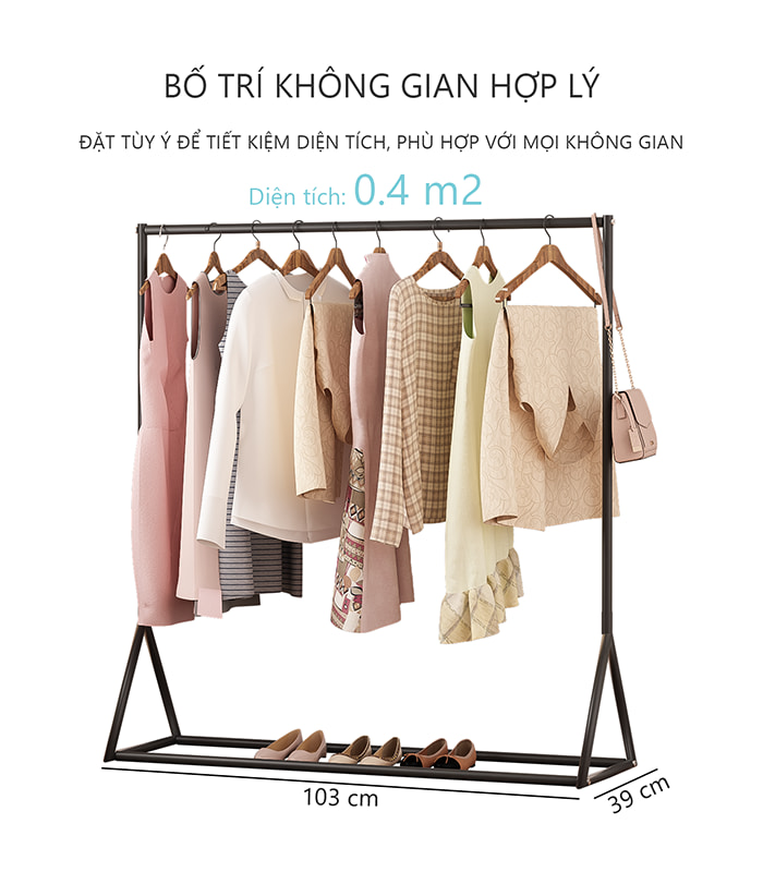 Với kích thước lý tưởng, giá treo GM01 không chiếm quá nhiều diện tích nhưng vẫn đảm bảo sự tiện ích tối đa cho không gian sử dụng. Chiều cao 146cm, chiều dài 103cm và chiều rộng 39cm kết hợp cùng nhau giúp cho sản phẩm dễ dàng phù hợp với mọi không gian nhỏ hẹp, từ căn hộ chung cư, homestay nhỏ xinh cho đến phòng trọ. Thiết kế nhỏ gọn sẽ tiết kiệm diện tích tối đa đồng thời mang đến vẻ thẩm mỹ tối giản và hiện đại.