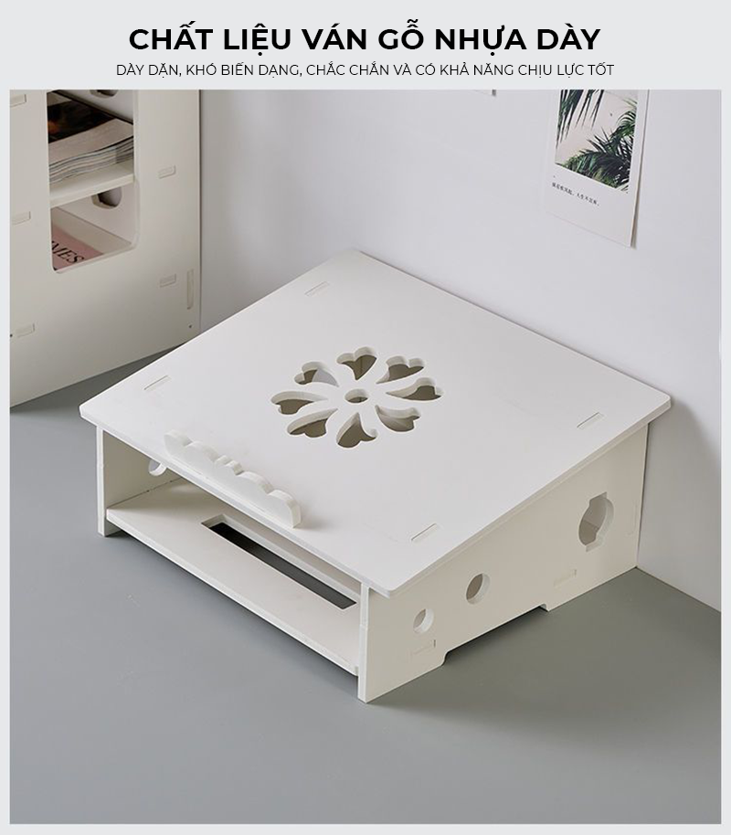 | Chức năng | Nâng cao màn hình laptop ngang tầm mắt, cải thiện tư thế ngồi, giảm đau mỏi vai gáy; hỗ trợ tản nhiệt cho laptop, tạo không gian lưu trữ bàn phím/chuột |