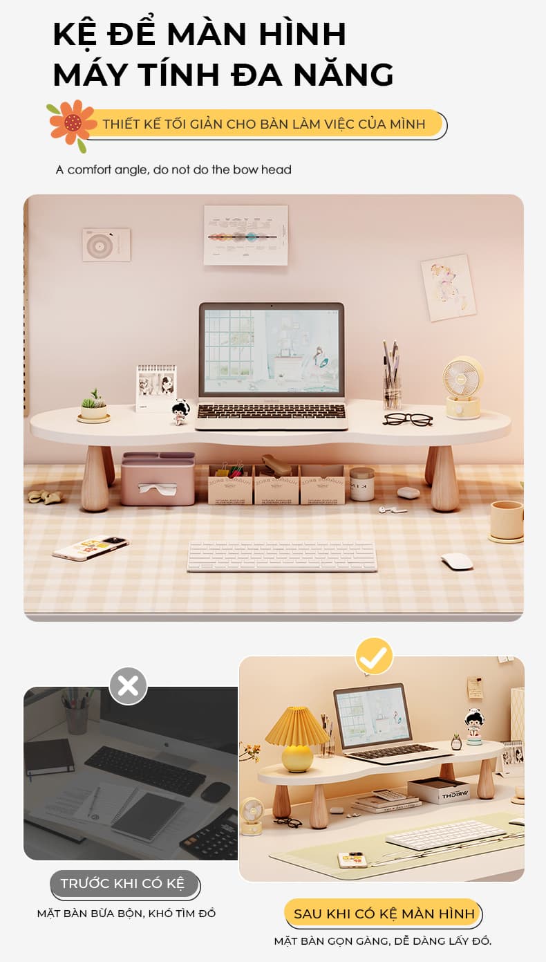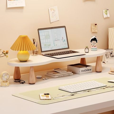 Với mình, điểm cộng lớn nhất là kệ vừa để màn hình, vừa tận dụng làm chỗ để sổ tay, loa mini, hay mấy món đồ decor nhỏ nhỏ cho bàn làm việc thêm sinh động. Nếu thích, bạn có thể đặt kệ ở bất kỳ vị trí nào tùy ý – góc học tập, phòng ngủ hay thậm chí là bàn trang điểm đều ổn áp.