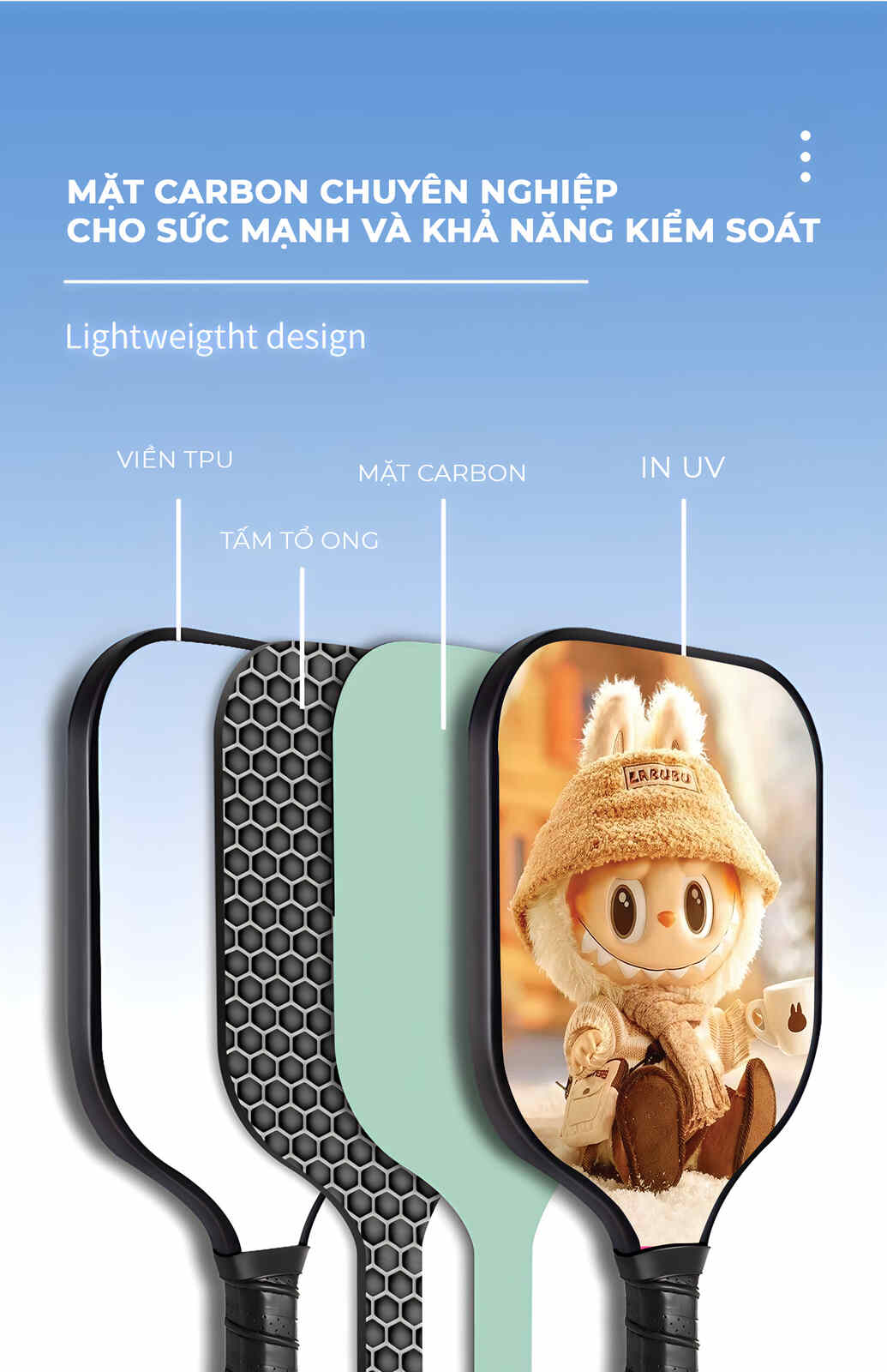 - Mặt vợt carbon chuyên nghiệp kết hợp lớp in UV sắc nét, tăng độ bền, giúp kiểm soát bóng tốt và tạo lực đánh mạnh mẽ.