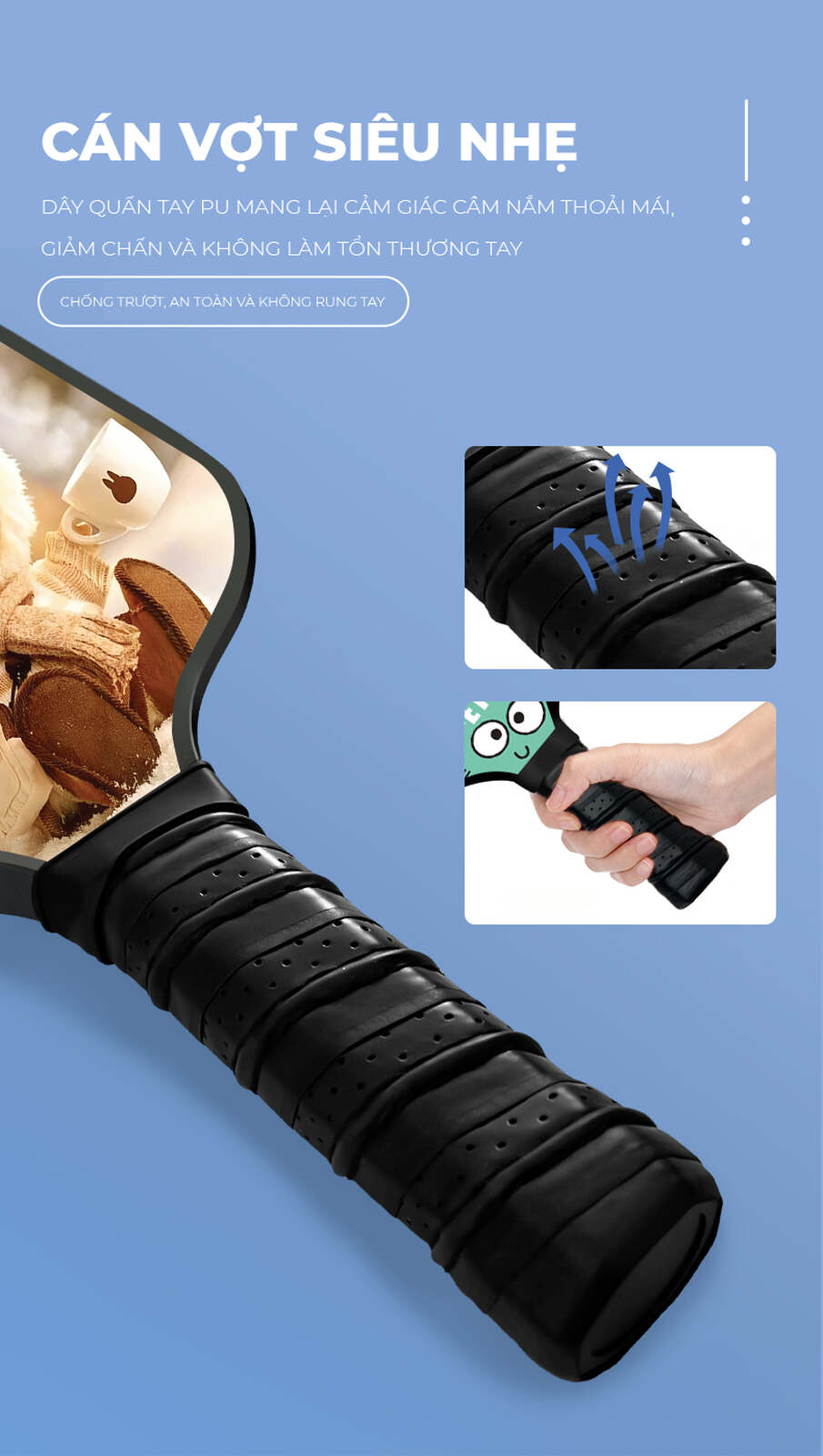 - Cán vợt siêu nhẹ, quấn tay PU êm ái, chống trượt, giảm rung, bảo vệ tay bé khi chơi lâu.